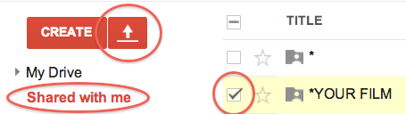 To access your GoogleDrive folder, click on “Shared with me” in the left-hand column (see example below). To upload your materials, make sure the folder is selected and click the upload icon next to the “Create” button.