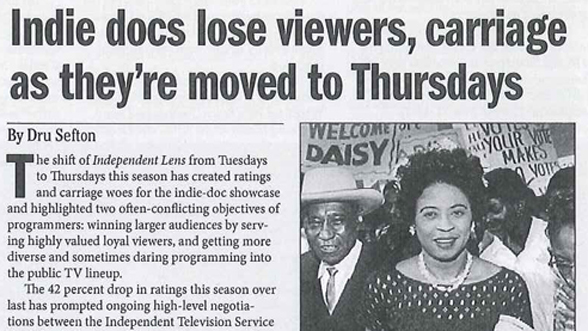 Current: Indie docs lose viewers, carriage as they're moved to Thursdays The shift of Independent Lens from Tuesdays to Thursdays this season has created ratings and carriage woes for the indie-doc showcase and highlighted two often-conflicting objectives of programmers: winning larger audiences by serving highly value loyal viewers, and getting more diverse and sometimes daring programming into the public TV lineup.