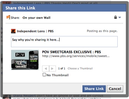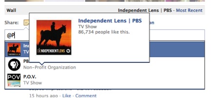 • Share and tag generously. When you’re starting out, be sure to “like” pages of related brands. For example, for Community Cinema, we “like” the pages of our national partners, non-profits, and community groups who help us with our free screening series. Once your page “likes” another, you can tag them in your posts by placing an “@” before their name in the text (Facebook will automatically narrow your liked pages to the ones it thinks you mean so you can select). Also, if you see news or links in your newsfeed you think your fan base would like, share the posts using the share button under the post to put it on your own wall. This breeds goodwill and a sense of cooperation, which makes it more likely those pages will share your content in kind.