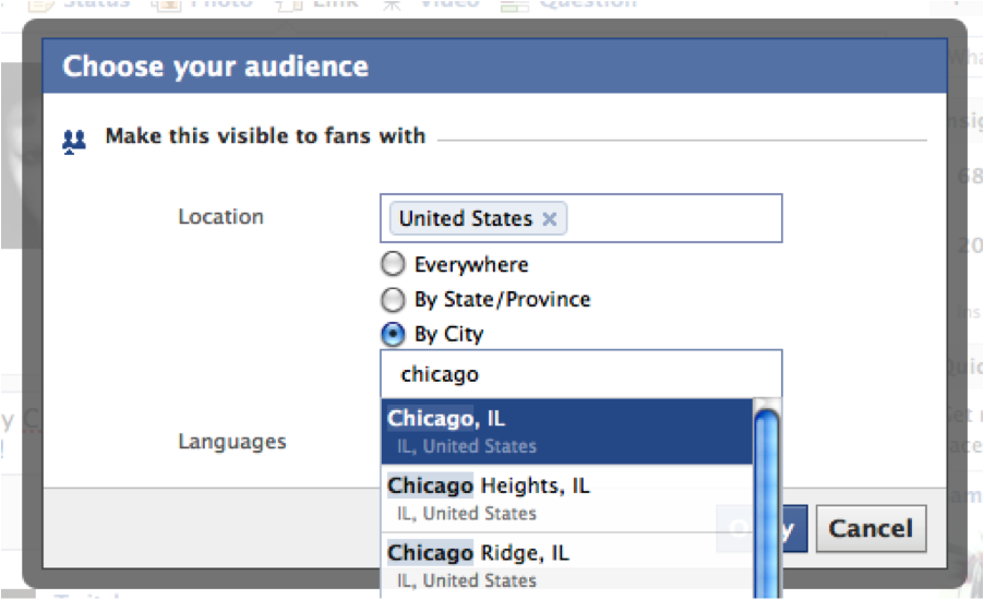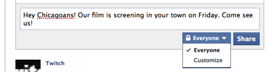 If your film is screening in Chicago, how much sense does it make to just post that fact on your film’s Facebook fan page, where most of your fans are probably not from Chicago? Not much, for a couple of reasons. First, as we know from a previous Being Social column, only about 25 percent of your fans will see any given post. That means only 25 percent of your fans in Chicago are likely to see your announcement. That’s not effective, and it looks pretty ham-fisted to your fans who live nowhere near Chicago.